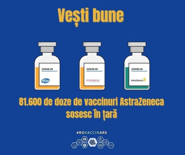 81.600 doze de vaccin AstraZeneca vor ajunge, mâine dimineață, la Institutul Național de Cercetare Dezvoltare Medico-Militară „Cantacuzino”. Transportul este asigurat de firma producătoare, iar dozele de vaccin vor fi aduse la București pe cale terestră.