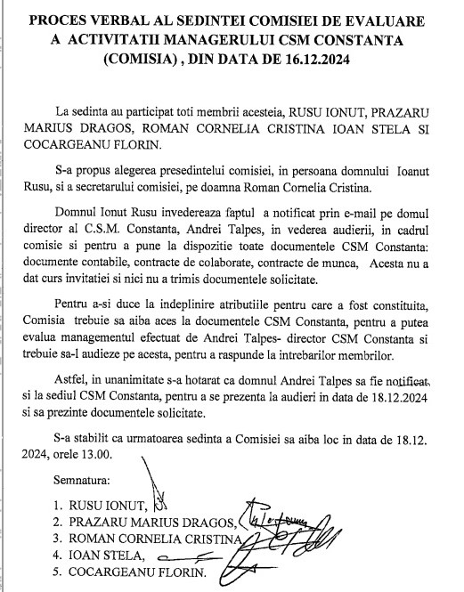 ”Andrei Talpeș nu s-a prezentat la audierile comisiei și a refuzat să pună la dispoziție documentele solicitate, nerespectând obligațiile care îi revin conform contractului de management. Totodată, managerul CSM Constanța a desfășurat, pe parcursul mandatului, un management defectuos care a dus la acumularea de datorii de la un mandat la altul. Andrei Talpeș nu a luat măsurile necesare pentru a se încadra în bugetul alocat. Reamintim faptul că CSM Constanța a beneficiat în 2024 de un buget de 35.000.000 lei(aproximativ 7.000.000 de euro), fonduri care nu au acoperit integral cheltuielile angajate de conducerea clubului plus datoriile din anul 2023 când a avut alocat un buget de 10 milioane de euro.