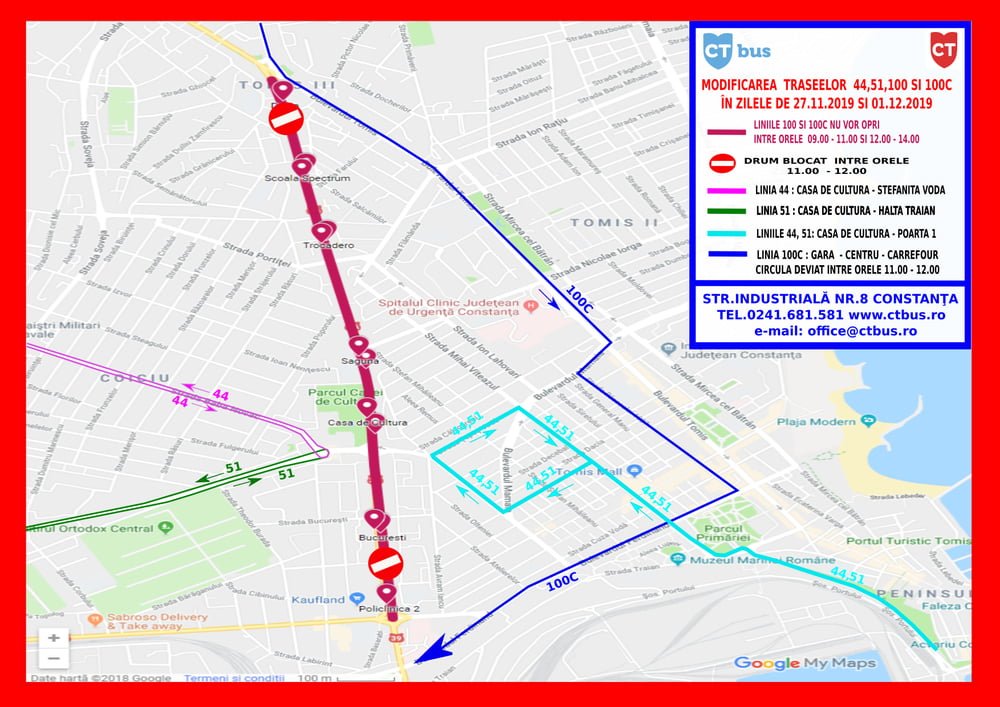 • în intervalul orar 09:00 – 11:00 – liniile 100 și 100C vor circula fără oprire pe porțiunea de drum cuprinsă între I.C. Bratianu (zona ICIL) și Bvd. Tomis (zona Dacia);