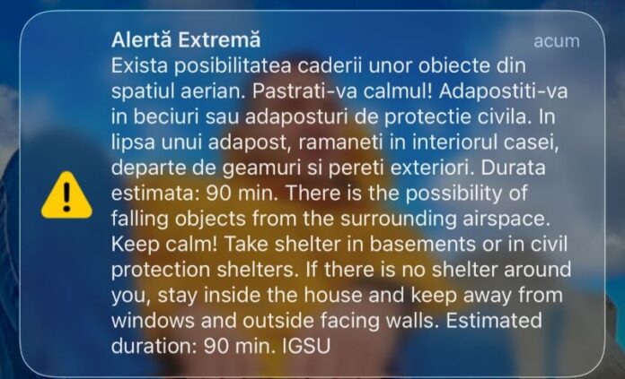 În urmă cu scurt timp, Inspectoratul General pentru Situații de Urgență a emis un mesaj RO-Alert pentru nordul județului Tulcea prin care populația este informată despre posibilitatea căderii unor obiecte căzute din spațiul aerian.