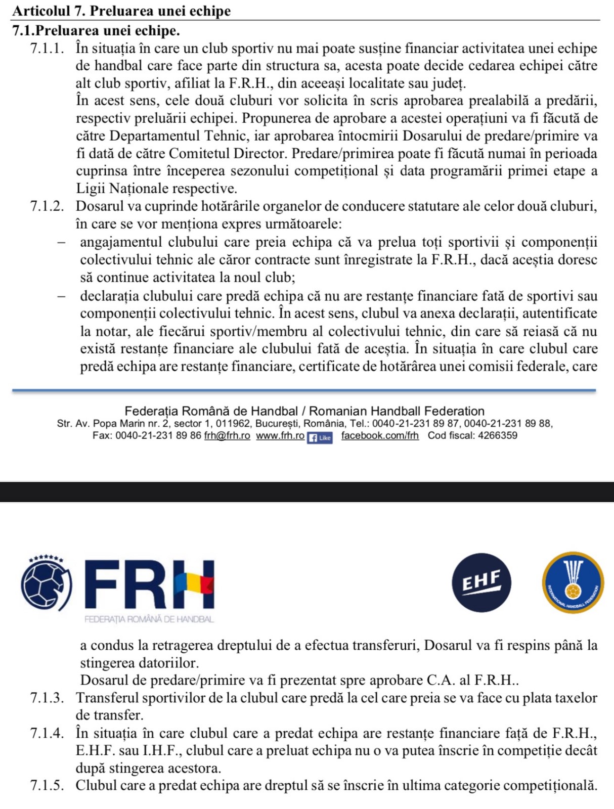 Precizăm că toate hotărârile comisiilor Federației Române de Handbal au fost contestate prin acțiune în anulare în fața instanțelor de judecată, conform articolului 608 din Codul de procedură civilă. Până în acest moment, nu a fost pronunțată nicio soluție definitivă în aceste cazuri. Arătăm că Federația Română de Handbal nu a adoptat competența Tribunalului de Arbitraj Sportiv de la Lausanne în această privință, tocmai pentru ca hotărârile acestora să nu poată fi supuse „riscului” desființării acestora ca urmare a analizei oricăror hotărâri ale comisiilor acesteia de către o instanță cu adevărat independentă și imparțială, respectiv Tribunalul de Arbitraj Sportiv de la Lausanne.