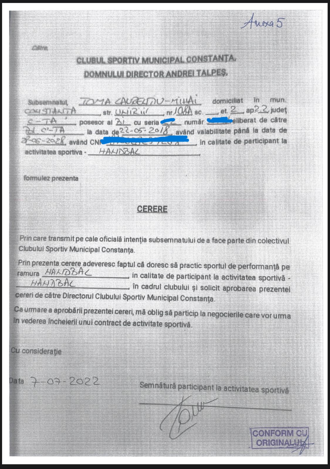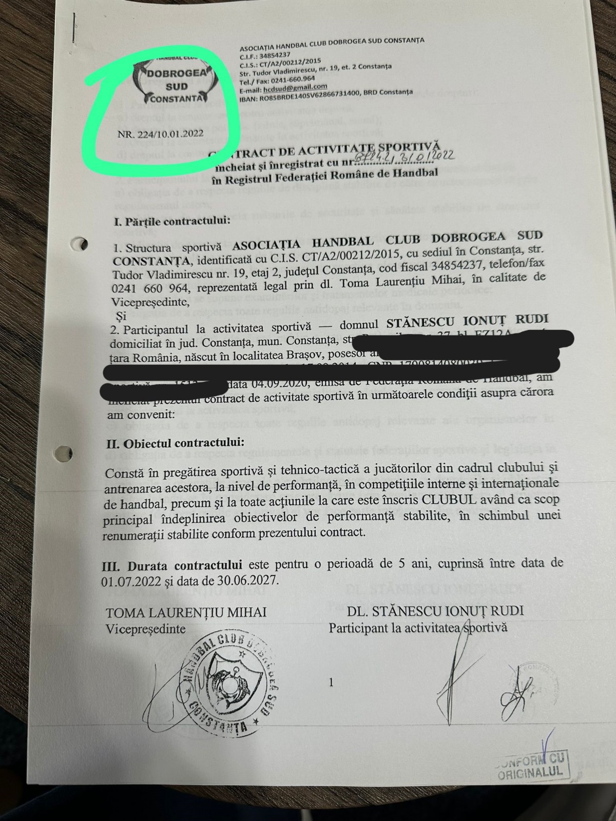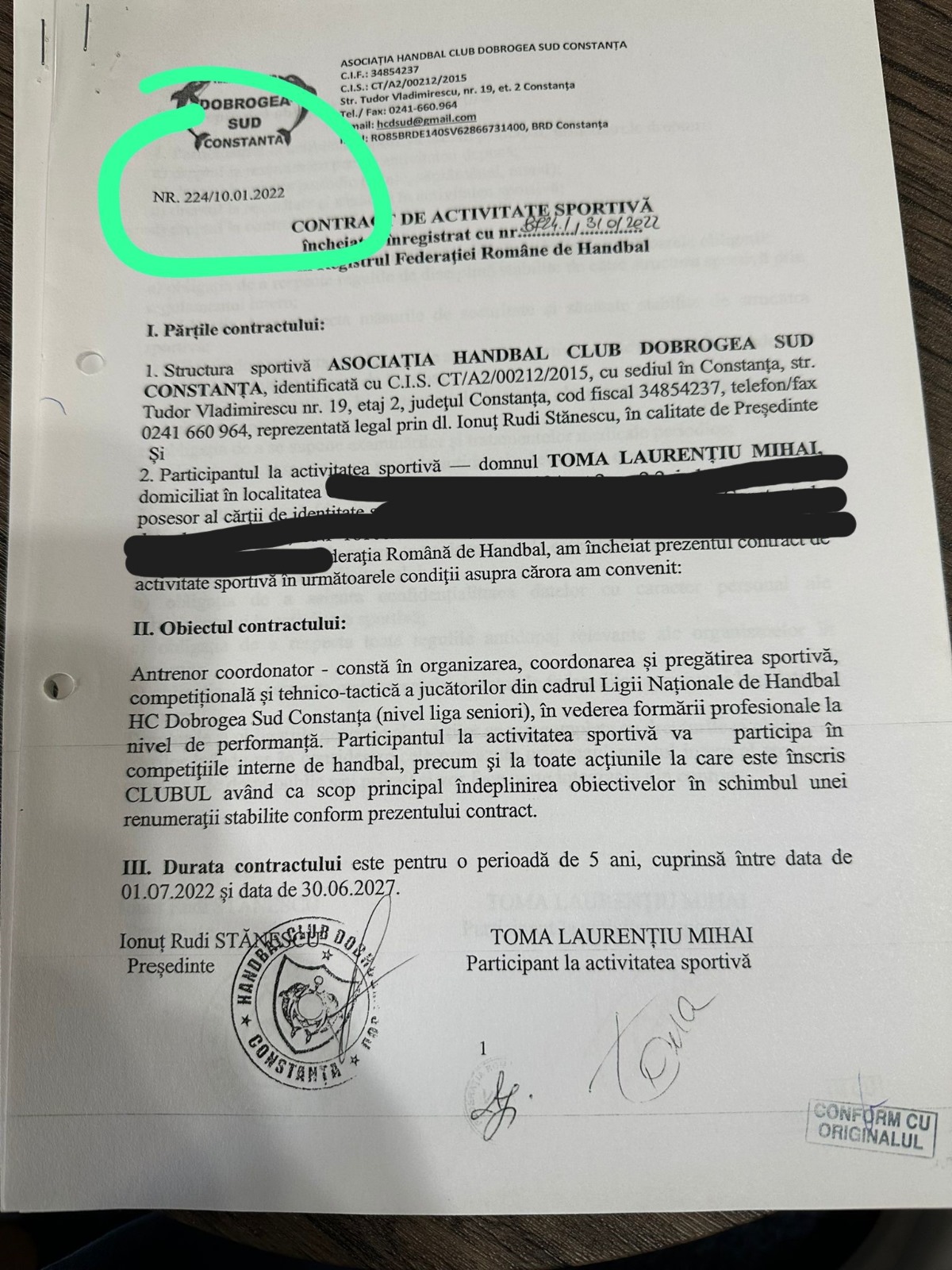 Mai mult, de remarcat este și faptul că aceste contracte semnate de Toma Laurențiu Mihai pentru Stănescu Rudi și viceversa (Foto 3 și Foto 4) au fost încheiate cu Asociația Handbal Club Dobrogea Sud în condițiile în care, la data pretinsă a încheierii acestora, aceștia aveau deja contracte în vigoare. În concret, în luna iulie 2022, pentru decontarea ultimei tranșe din contractul de finanțare nr. 162474/17.08.2021 la Primăria Municipiului Constanța, au fost depuse alte contracte, respectiv pentru Stănescu Rudi Ionuț: Contract de activitate sportivă înregistrat la Federația Română de Handbal sub nr. 5119 din 12.08.2020, având o valabilitate de 4 ani, respectiv până la data de 30.06.2024, împreună cu Actul adițional înregistrat la Federația Română de Handbal sub nr. 6443 din 08.03.2021; pentru Toma Laurențiu Mihai: Contract de activitate sportivă înregistrat la Federația Română de Handbal sub nr. 3851 din 04.10.2019, cu o valabilitate de 5 ani, până la data de 30.06.2024, și Actul adițional cu nr. 7002 din 20.07.2021, înregistrat la Federația Română de Handbal.