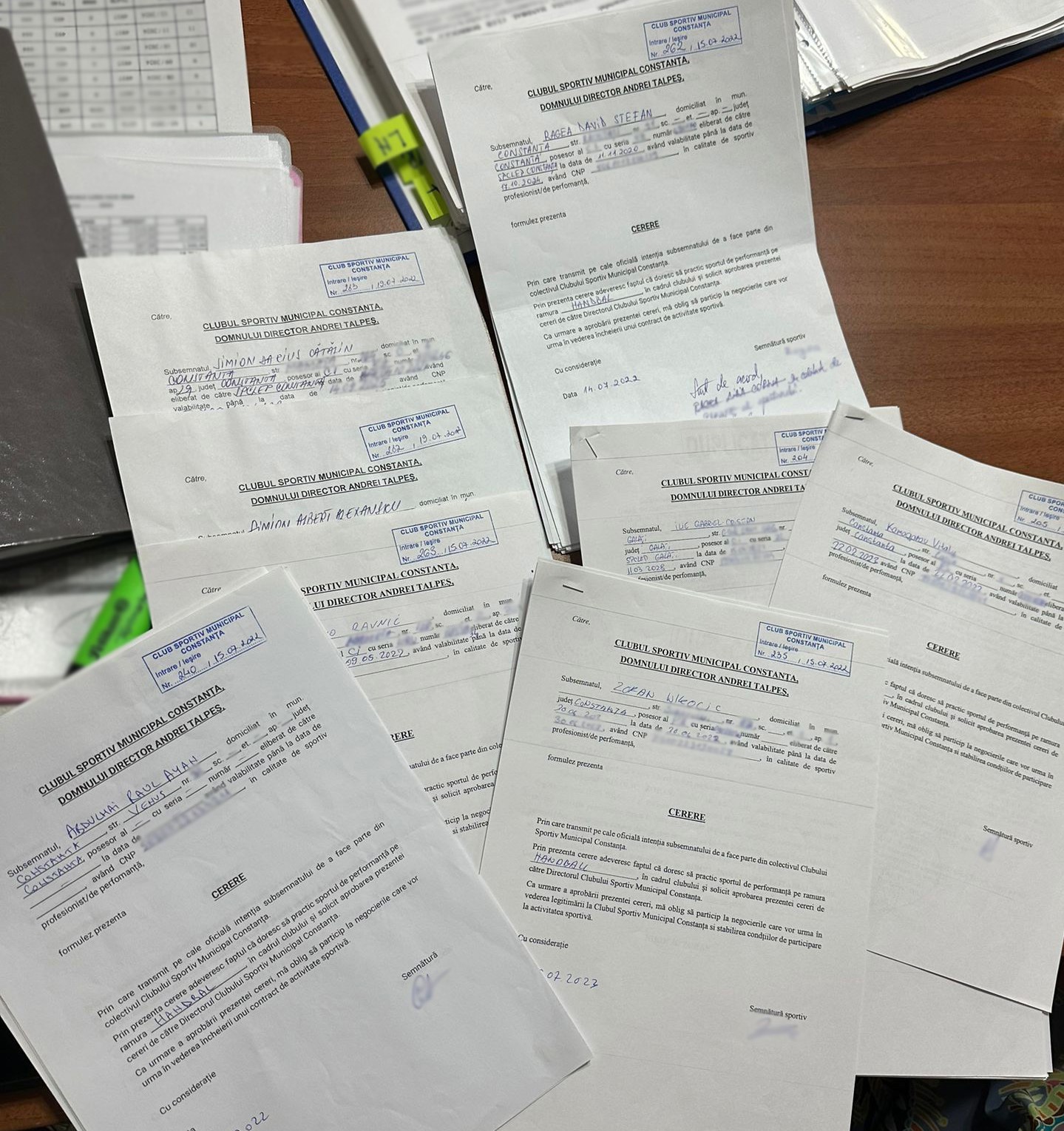 În ciuda acestor fapte, domnul Toma Laurențiu Mihai a solicitat ulterior comisiilor cu atribuții jurisdicționale a Federației Române de Handbal plata remunerațiilor aferente unui contract de activitate sportivă încheiat cu Asociația Handbal Club Dobrogea Sud contract ce nu a fost asumat de Clubului Sportiv Municipal Constanța. Suma revendicată se ridică la aproximativ 270.000 EUR, iar ca „dovadă” a faptului că și-a exprimat intenția de a-și continua activitatea în cadrul clubului nostru a depus o cerere de continuare a activității la Clubul Sportiv Municipal Constanța (foto 2) fără a face dovada înregistrării sau comunicării acesteia către clubul nostru și fără a purta vreun număr de înregistrare. Mai mult, spre a dovedi „înregistrarea” unor astfel de cereri (admițând implicit că acestea nu au fost înregistrate și comunicate clubului nostru) a solicitat audierea unor martori pentru dovedirea acestor aspecte, ce nici măcar n-au fost audiați de către Comisiile Federației Române de Handbal, aspecte ce nu le-au împiedicat să concluzioneze în mod nelegal și în ciuda evidenței cum că acest contract ar fi fost preluat de către Clubul Sportiv Municipal Constanța.