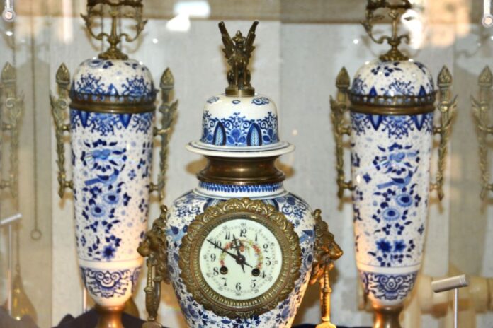Set de ceas cu două anse / urne pentru șemineu realizat din porțelan Delft și elemente din bronz . Ceas mecanic Japy Freres cu cadran ceramic cu motive florare și cu cifre arabe. Sfârșit de secol XIX.
