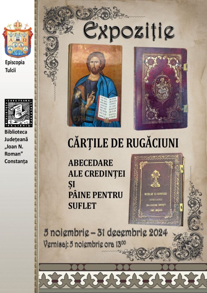 Episcopia Tulcii, în parteneriat cu Biblioteca Județeană „Ioan N. Roman” Constanța, vă invită la vernisajul expoziției temporare „Cărțile de rugăciuni – abecedare ale credinței și pâine pentru suflet”. Evenimentul va avea loc marți, 5 noiembrie 2024, de la ora 13:00, la Biblioteca Județeană Constanța, în holul central de la parter. Expoziția este deschisă pentru public în perioada 5 noiembrie – 31 decembrie 2024.