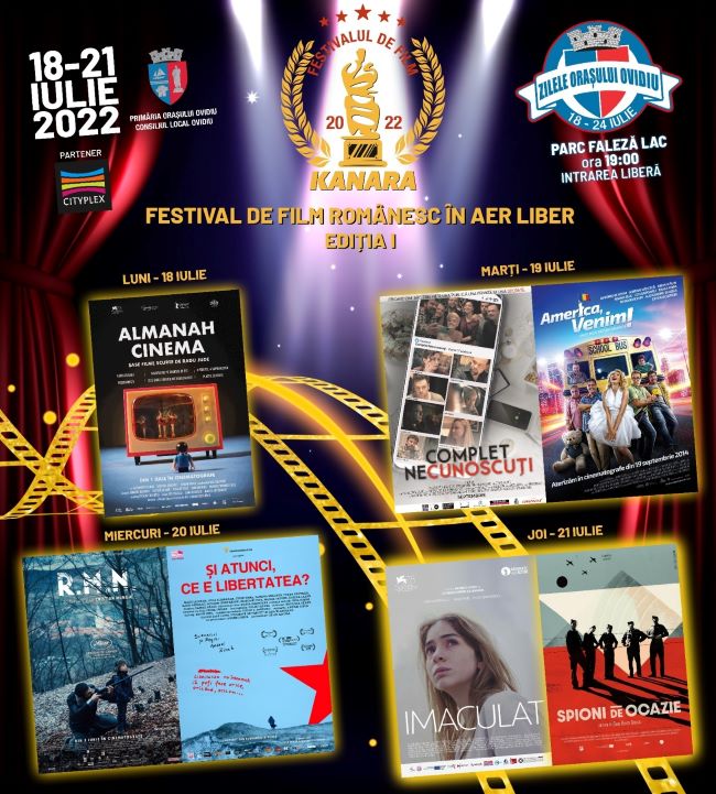 Astfel, în zilele de 18, 19, 20 și 21 iulie se va desfășura prima ediție a ”Festivalului de Film Românesc în aer liber – Kanara”, începând cu ora 19.00, în Parc Faleză Lac.
