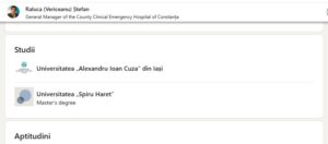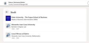 Există, însă, două profiluri LinkedIn din care aflăm informații contradictorii: într-unul apare menționat un MBA și Universitatea „Alexandru Ioan Cuza” din Iași, iar în celălalt dispare MBA-ul, fiind menționată Universitatea „Spiru Haret”.