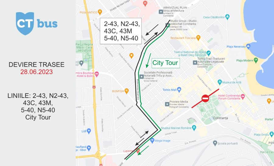 Mâine, 28 iunie 2023, circulația va fi restricționată total, în intervalul orar 08:00-24:00, pe tronsonul cuprins între strada Mihai Viteazul și bulevardul Tomis.