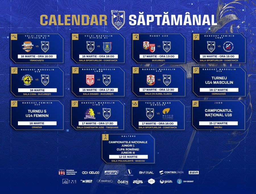Avem o nouă săptămână cu meciuri și competiții importante pentru sportivii CSM Constanța! Tenisul de masă ține capul de afiș cu meciul din semifinalele Europe Cup Women, care va avea loc în Sala Sporturilor. Baschetbalistele încep lupta pentru titlu, iar băieții pentru play-off-ul Ligii Naționale Getica ’95. La volei, echipele noastre joacă ultimele partide din sezonul regulat al Diviziei A1, iar echipele de rugby și baschet au jocuri importante în campionatele de tineret și juniori. Sportivii noștri luptă pentru medalii în competițiile naționale de juniori la judo și haltere. Tuturor, le urăm succes! Hai, Constanța!