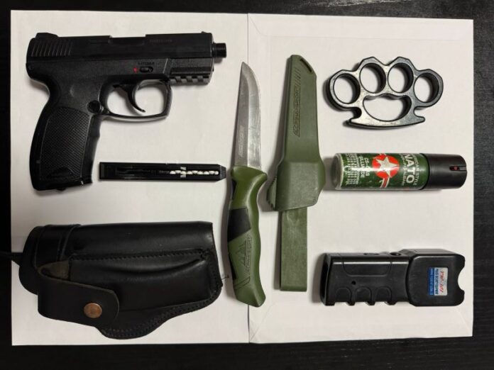 Forțele de ordine au procedat la interceptarea și legitimarea bărbatului, acesta prezentându-le jandarmilor mai multe obiecte pe care le avea asupra sa: un box, un spray cu substanță iritant-lacrimogenă, un dispozitiv cu electroșocuri, un cuțit cu lama de aproximativ 11 centimetri și lungimea totală de aproximativ 23 de centimetri și un pistol de tip airsoft, cu încărcător cu bile de plastic.