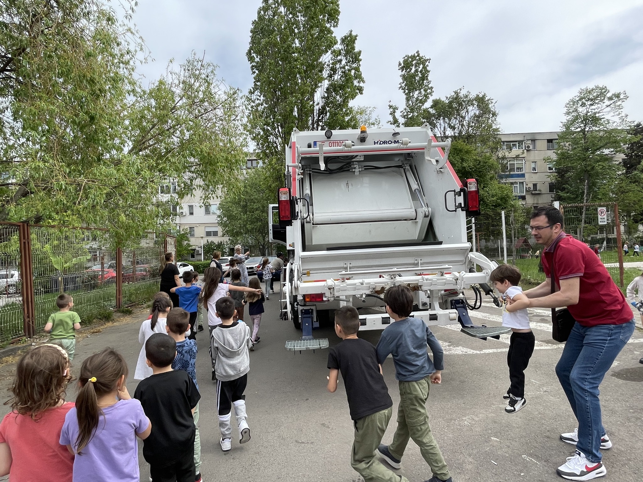 După încheierea lecției de ecologie, copiii au desfășurat o acțiune de ecologizare în curtea grădiniței și au avut ocazia să exploreze modul de funcționare al unei autogunoiere.