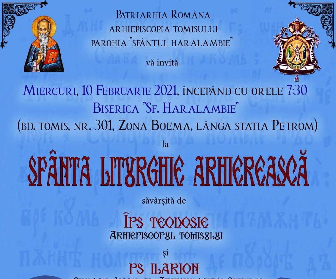 – de la ora 8.00, preoții și credincioșii parohiei „Sfântul Haralambie” din Constanța vor întâmpina doi ierarhi la intersecția bulevardelor Tomis și Aurel Vlaicu (zona vapor), apoi vor merge în procesiune la biserică, unde va fi oficiată Sfânta Liturghie de către IPS Teodosie, Arhiepiscopul Tomisului, împreună cu invitatul său, PS Ilarion, Episcop vicar al Arhiepiscopiei Sibiului.