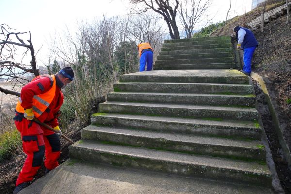 Se decolmatează șanturile pentru a pregăti terenul pentru amplasarea rigolelor din beton. De asemenea, se înlătură bordurile de beton de pe partea laterală a scărilor. Treptele urmează să fie stabilizate prin montarea de cofraje din metal. Se vor placa cu oțel contratreptele și pereții laterali ai scărilor.