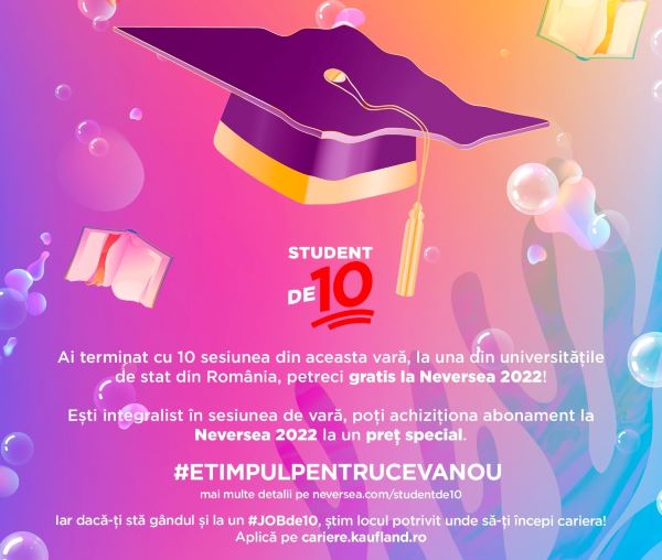ESTERA ANGHELESCU, Recruiting & Employer Branding Director, Kaufland România: “Susținerea campaniei “STUDENT DE 10” a reprezentat un pas firesc pentru Kaufland România, venind în completarea unei inițiative de tradiție, “BAC DE 10”, care recompensează rezultatele deosebite ale liceenilor. De data aceasta, ne-am dorit să susținem nu doar reușitele academice excepționale, ci și eforturile, seriozitatea și implicarea studenților care promovează toate examenele, aceștia beneficiind de un discount consistent pentru a se bucura de experiența Neversea. În plus, sprijinim tinerii care își doresc să facă un prim pas spre o carieră de succes cu un pachet atractiv de programe și joburi dedicate tinerilor, toate acestea fiind accesibile printr-un proces rapid de aplicare online, pe cariere.kaufland.ro. Și pentru că știm cât de important este un program flexibil pentru studenții care aleg să urmeze un internship sau care își doresc să se angajeze, aceștia au inclusiv opțiunea de a opta pentru un job part-time, care le permite să dedice timp studiilor sau pasiunilor lor.”
