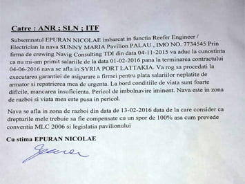 Epuran Nicolae, electrician pe nava Sunny Maria, a trimis în cursul zilei de ieri o scrisoare către Sindicatul Liber al Navigatorilor, prin care cere ajutorul autorităţilor române.